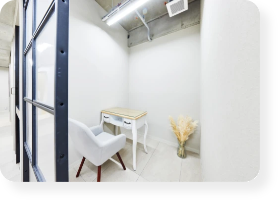施術ルームは全て個室。他の方に干渉されず、安心してサロンワークができます。複数人での利用可能なルームも完備しております。